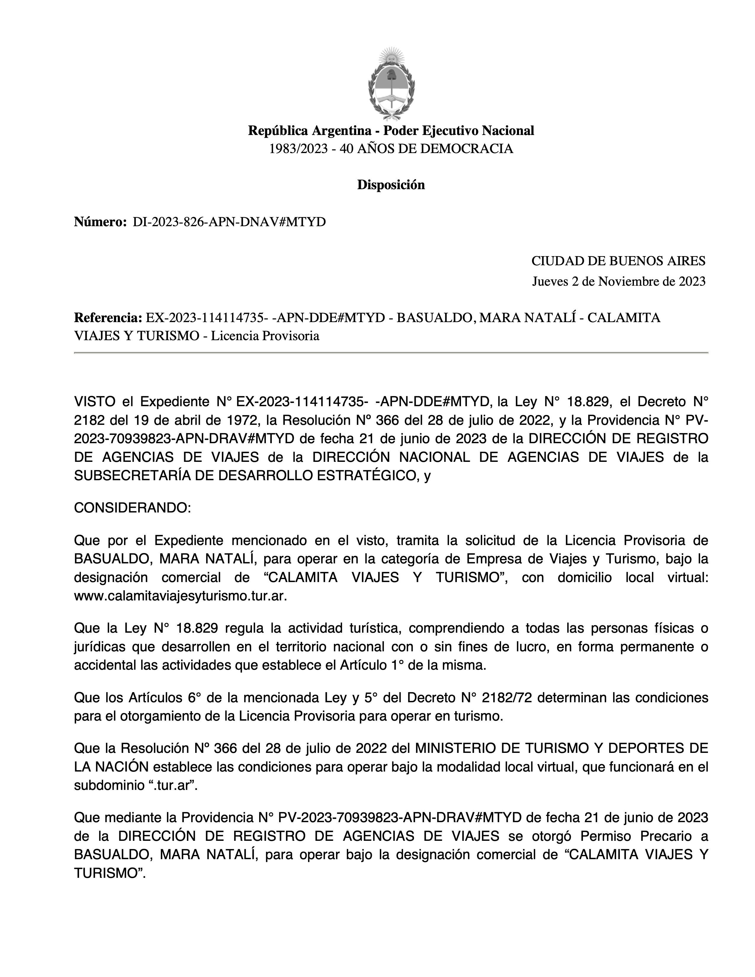 De acuerdo con la legislación vigente se exhibe imagen así como link de descarga de la Licencia habilitante de la agencia de viajes Calamita, Viajes y turismo, razón social Mara Natalí Basualdo. N° de Legajo: 18798